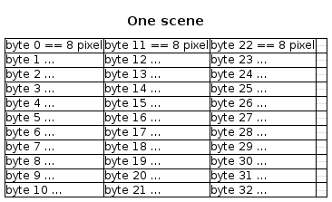 Let's say, you have 2 scenes, one is 11x32 pixels, one is 11x60 pixels. So, the first have 4 byte-columns and 44 bytes, the second has to be padded with 4 empty bit-columns in the last byte-column to 11x64 pixels and has therefore 8 byte-columns and 88 bytes.